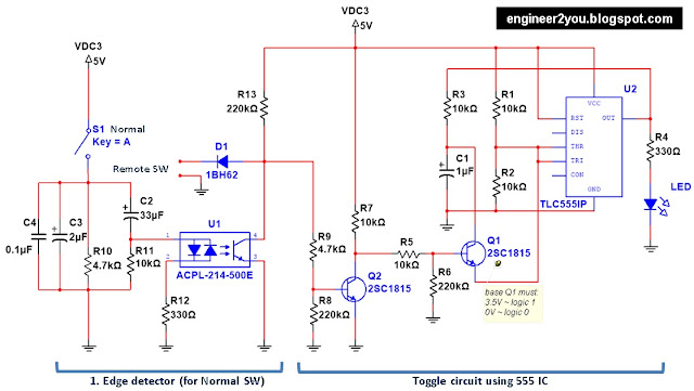 (1). Capacitor and opto are used to detect rising/ falling edge from "normal switch"